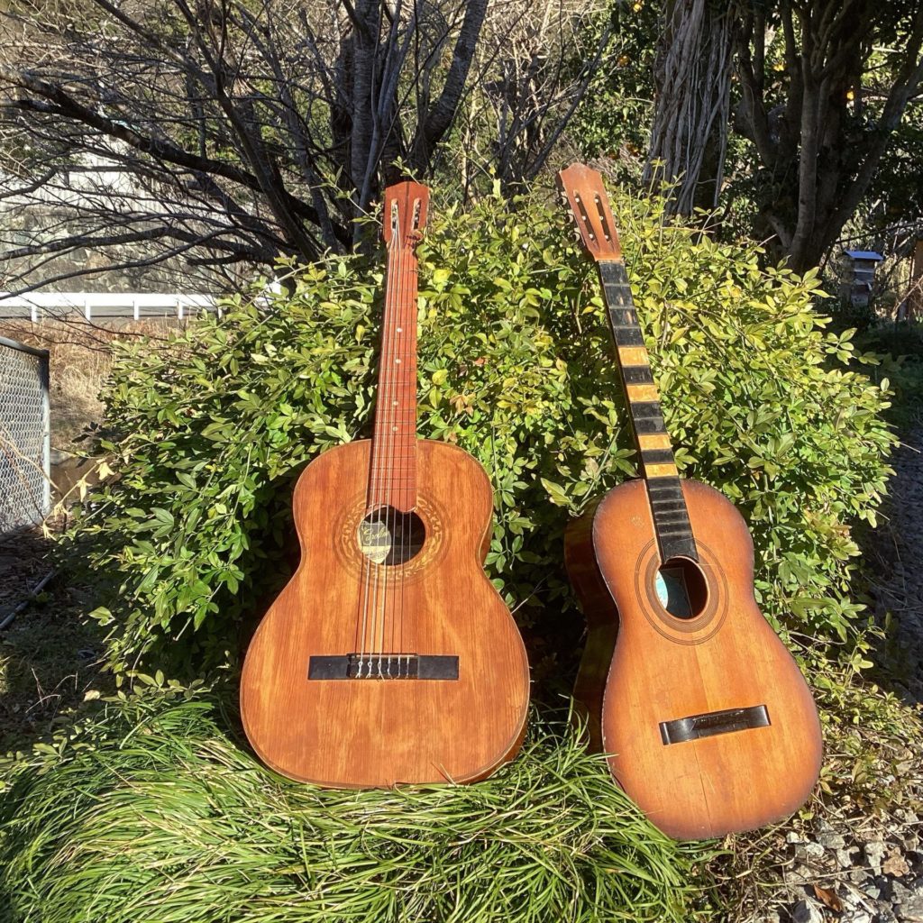 建築してると、ギターが寄ってくる(うちはね)んよな。きちんと直して返還したり、もらったままだったり。うちに来て10年以上ずーっと埃かぶってた「カロリーナギター」2本を、ええとこどりして一本に再生したじょ。多分わいと同い年くらい。右のんから移植したブリッジは、手で削った竹製です。大事にしまっせ。こんなんなんぼあってもええからねー!