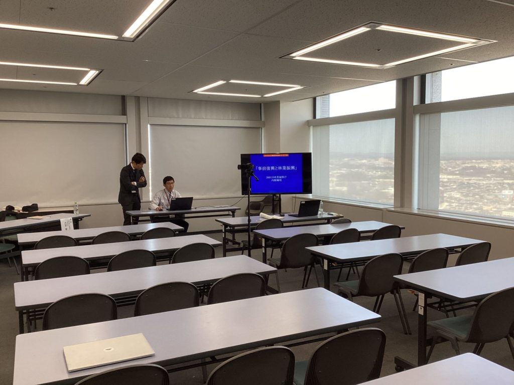 今年の第一回勉強会は茨城県庁。県の各課の皆さん他、各地の林務系の方々も参加して下さいます。「事前復興と林業振興」。バラバラだった資料を統合して最初の会です。うまく接続できてるかな…