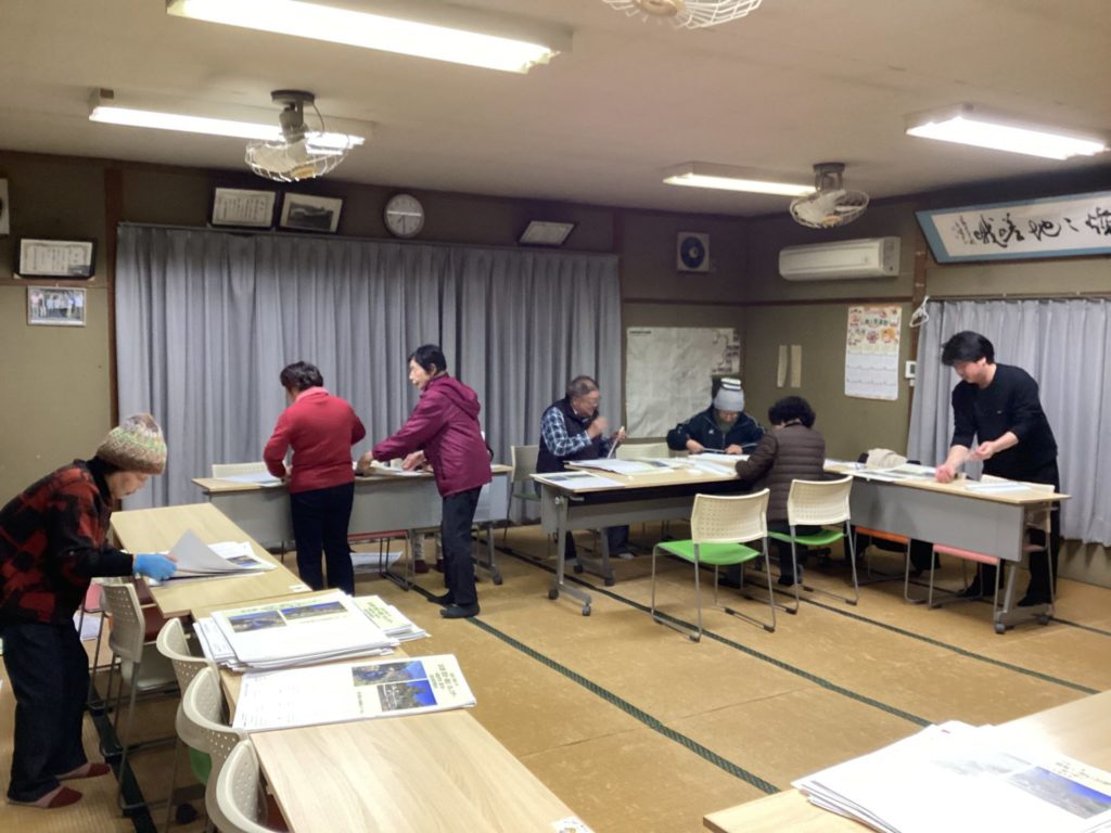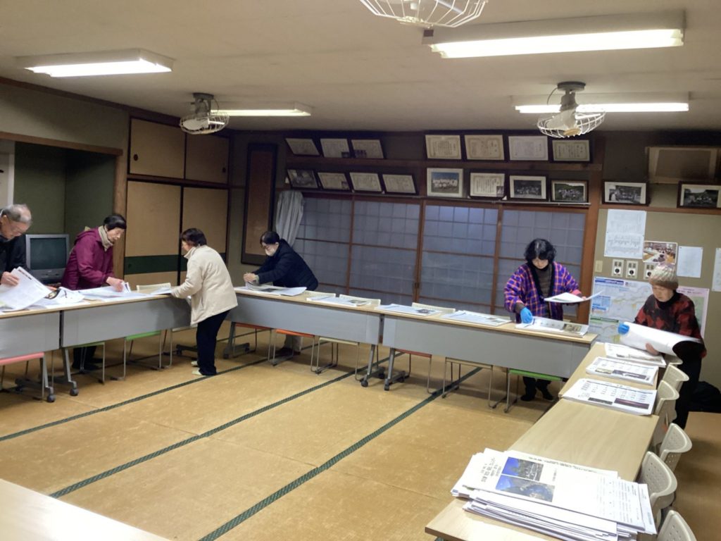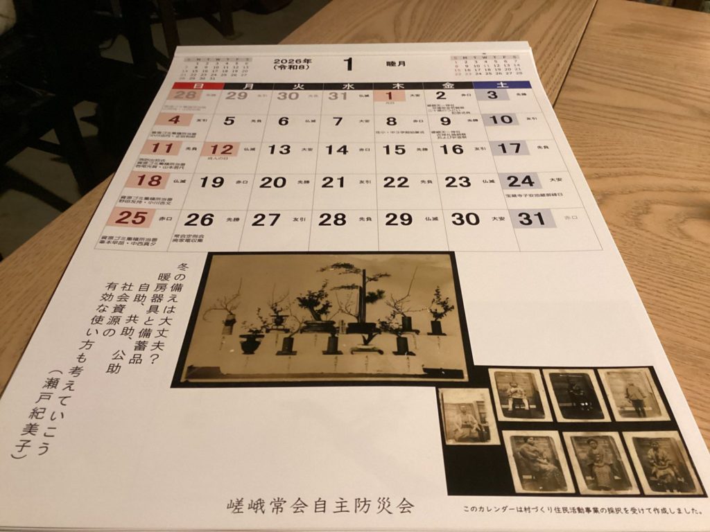佐那河内村嵯峨常会の自主防災会カレンダー2026。ネットプリントへの発注が年末になってもて、今宵やっとみんなで綴じ作業〜。一月の標語(みんな各月を担当してます)の賞味期間が半月に…すんません!!