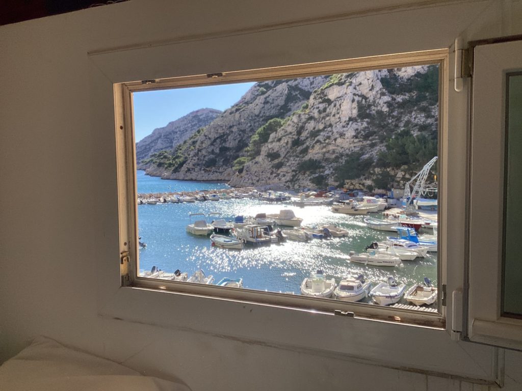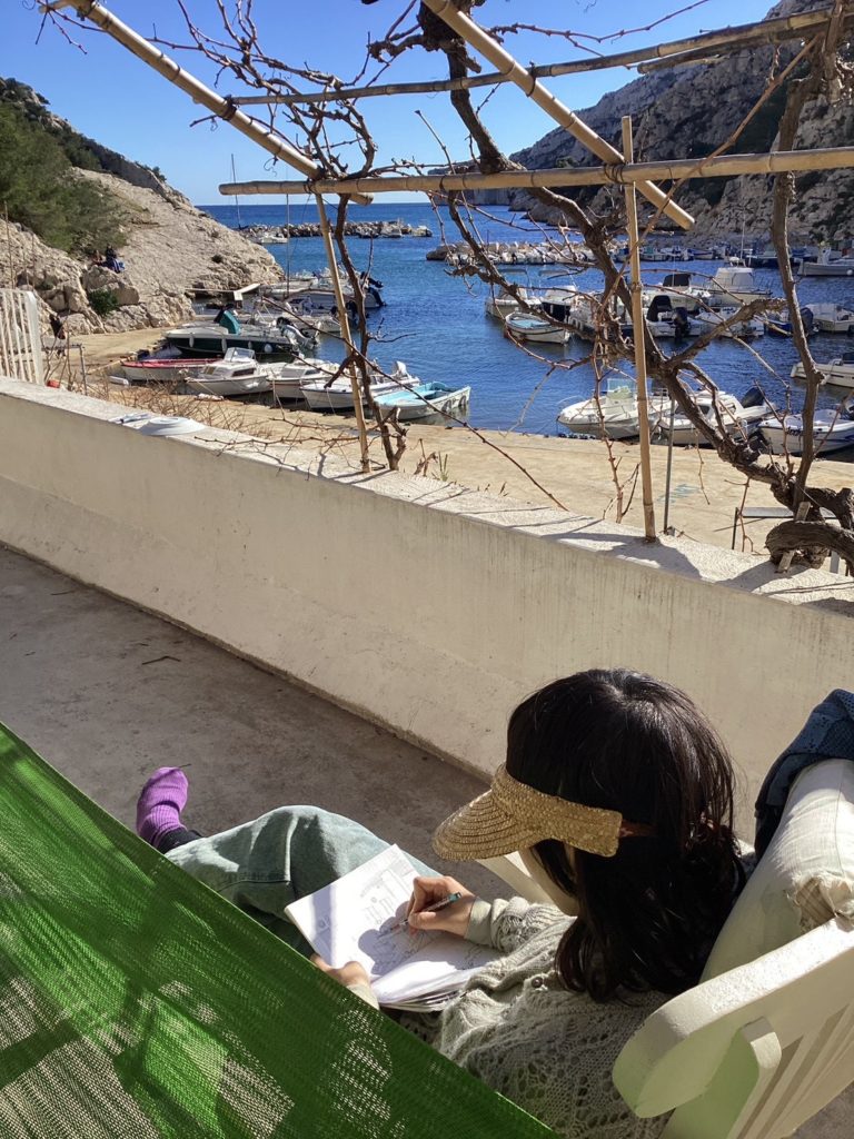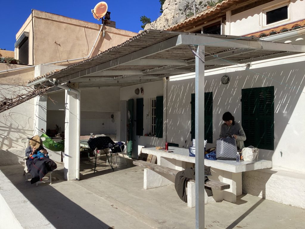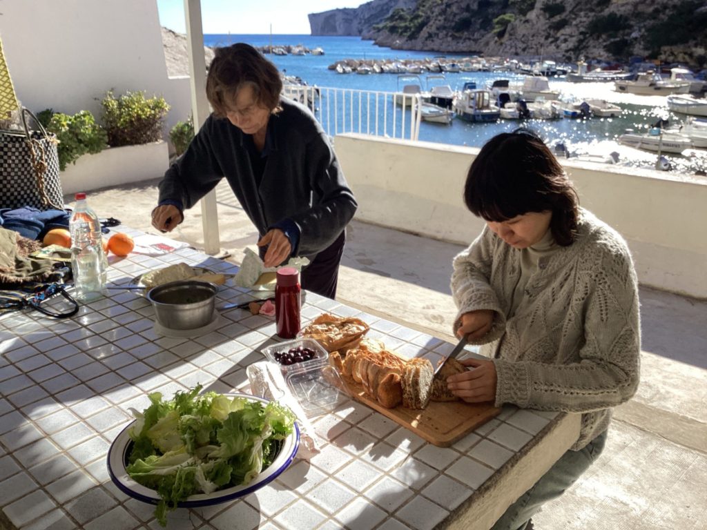 アニエスもレオも、昨日から明らかにたかぶっとるなあモルジウ行くとなって。アニエスはレオの産前、産後もここで過ごしたんやと。レオの、お医者さんしよったじいちゃんが調子に乗って(レオ談笑)買った別荘。その後に半島一帯が国定公園に指定されて、買った当時以上の観光地化はされないという、人口三十人のタイムカプセル的なところ。ゆっくり小さく寄せたり返したりの地中海が、陸地との境界線が呼吸してるみたいにたゆたゆしとる。なんか人の体の根源の部分と共鳴するみたいな気持ちよさ。人に還る、みたいな場所やなここは。