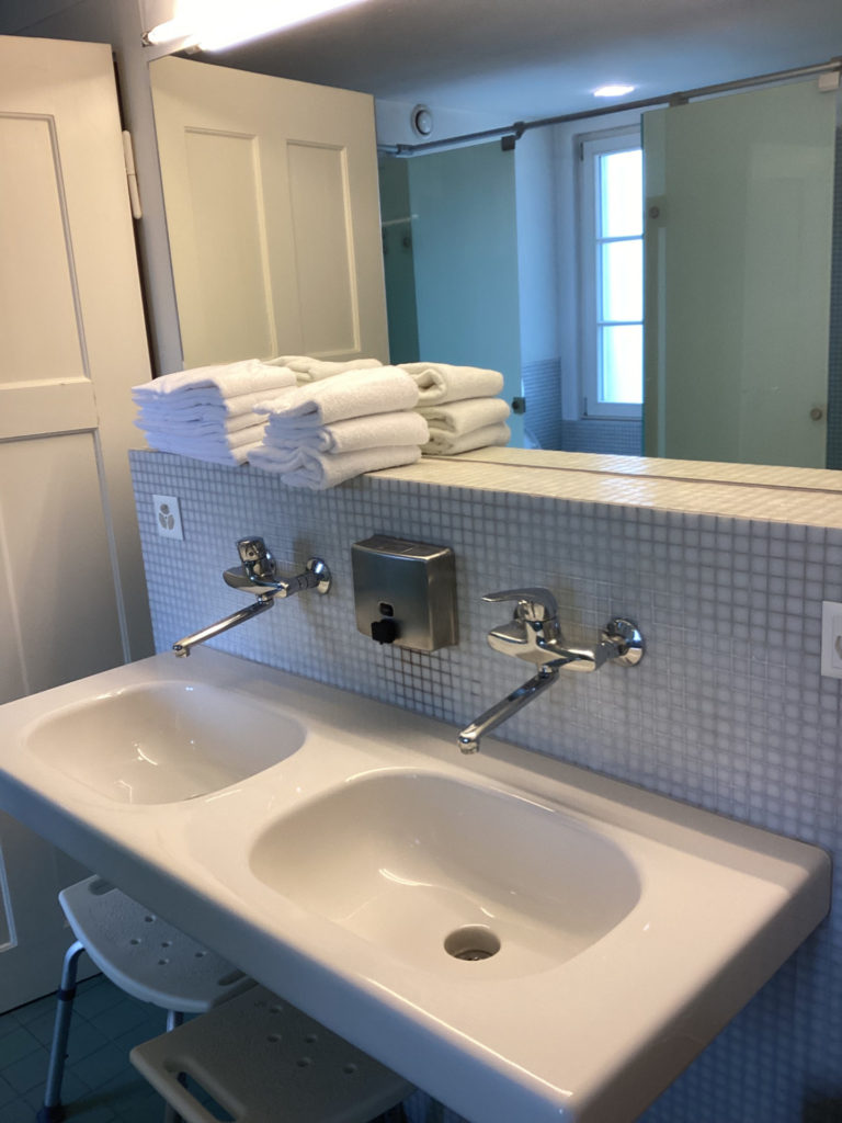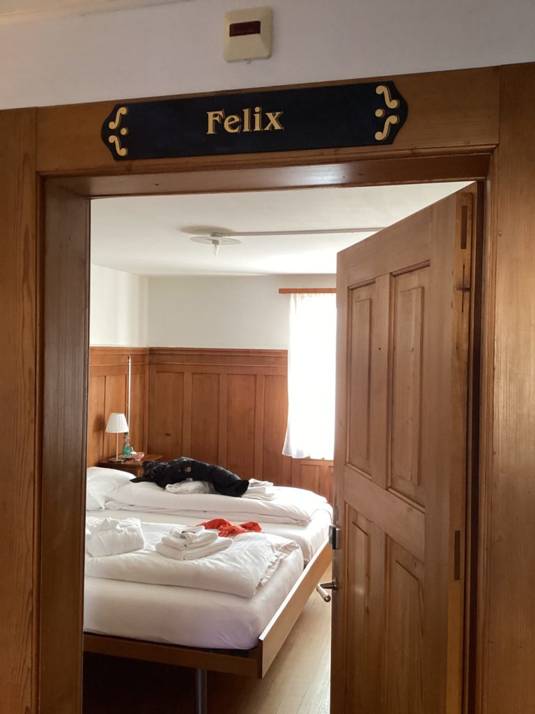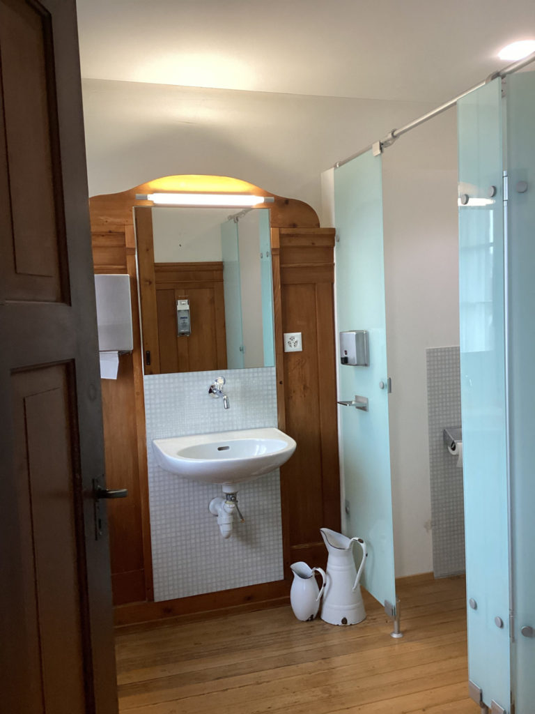 しかし、前回来たときは、バーゼルから在来線でコトコト走って、着いてみたらまあ田舎町で、店もないし民家しかないし。って感じやったけど。トラムがまず走っとるし、駅の周りは今風で、コンビニはあるわ線路向かいにスーパーはあるわで。えらい変わったもんやなあ。ネット予約してた元修道院らしいクロイスターホテル、きれいでシンプルで好感。テレビもないしトイレシャワーは共用やけど、何の問題もないどころかかえって部屋がすっきりしててよかったなあ。おススメです(誰に)。https://klosterdornach.ch/部屋は番号じゃなくて名前。わいの部屋はFelix。フランスのカトリック教会の司教の名前。他の部屋もそれらしい名前だった。
