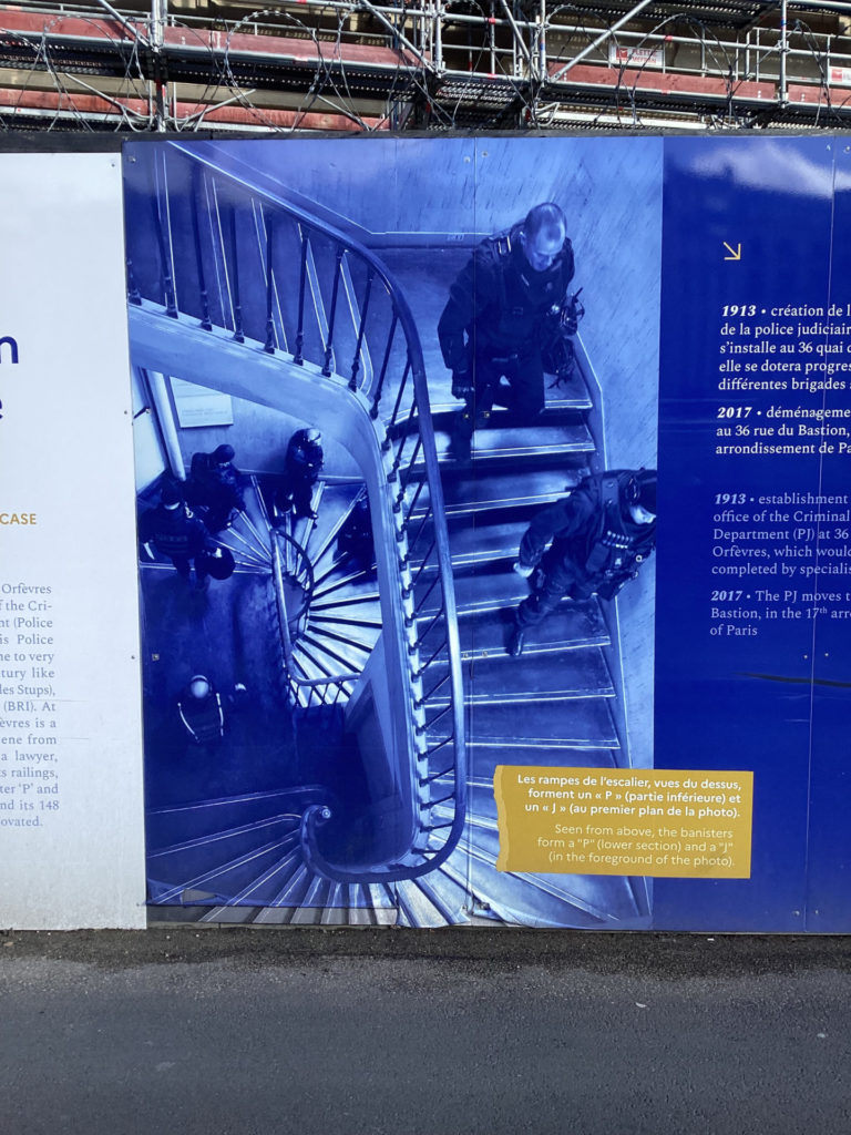 通りがかった大きな改修現場の仮囲いの外に詳細なこの建築の来歴が。セーヌ川に面したブロックの角の一角が全面改修中で、映画につかわれたりと有名な建築らしく。この写真は「PJ階段」て。下階の手すりが「P」、上の手すりが確かに「J」になってるな。さっきの、関係者を前面に出す看板といい、こういう、知的欲求をふと満たす看板といい、技術やアートと市民の近さを感じる場面がいっぱいやな。ほなけん、ほないに変な建築建ってないもんな。社会力レベルが高いというか。