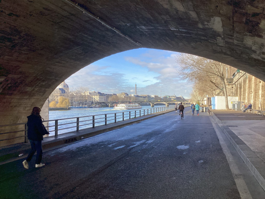 セーヌ川沿いの道。あ、遊覧ボートがいっきょるな。いろんなサイズのボートがあるな。遊覧だけじゃなくて、レストランや個人の舟とかいっぱい。ほんまにいっぱい。アニエスと家人と三人で、ミシェルが予約してくれてたでっかいボートに。ひょうたん島クルージングの、だいぶスケールちがうやつ。乗り込んだレベルは中なんやけど、みんなやっぱり上の甲板席へ。最初は東へ進みます。
