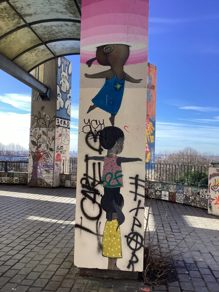 遠くにエッフェル塔も見える、丘の展望台。落書きだらけやけど、オリジナルのイラストはなんともいろいろ突き付けてくるな。柱ごとにいくつかの展開があって、景色と一緒に目に入るようになってます。あ、もしかしたらこれらも市民のアートかもしれんな。幾重にも、深いなあ。
