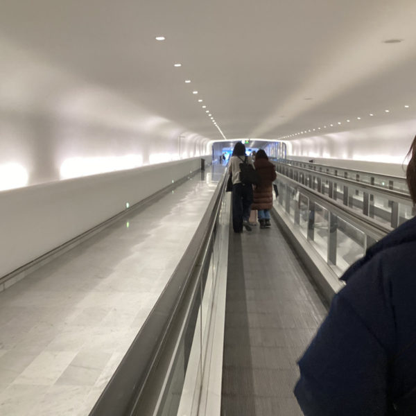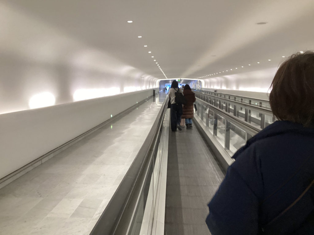 来るときは写真とれんかった、シャルルドゴール空港の、ウイングから中央のハブへのチューブですこれが。ここの通過中は一旦瞑想状態に・・・。日本だと、繰り返し繰り返し、アップに耐える女性のお顔のポスターが貼ってあるかも、「スペースは金なり」みたいな。このチューブは、パリでの実生活から、よその違う世界に渡るのに、一旦ニュートラルになりなはれーっていうしかけよな。「柱」はもともと「橋」で、つまりあちらとこちらを繋ぐもの、みたいな日本的な話もよぎりますな。誰の本だったっけ。