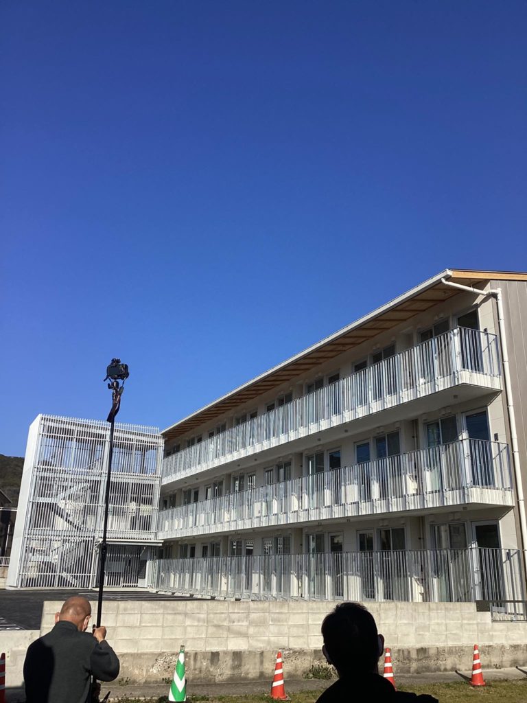 牟礼の木造3階建て単身者寮。竣工検査中の写真送ったら、明後日雨やし急遽、外だけでも撮りましょかーと、さっき駆けつけてくれました米津さん親子。ありがとうございます〜