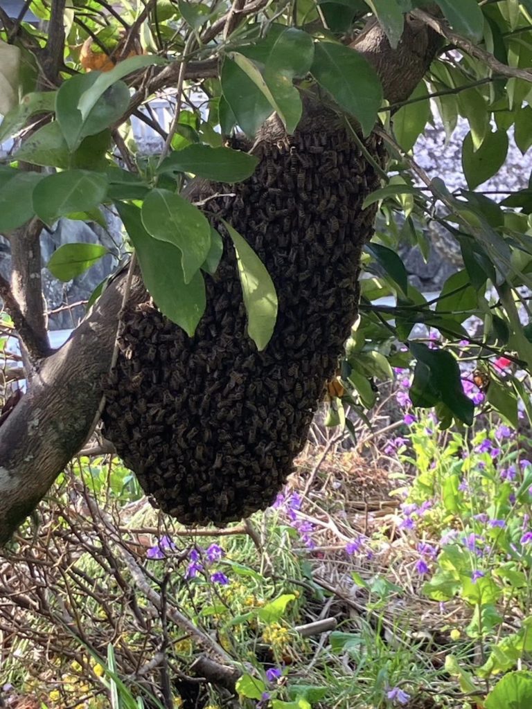 2号棟から第一群が分蜂。近所の蜂人(はちびと?)が駆けつけて、3号棟に入居手続きしてくれたそうです笑 素手で…